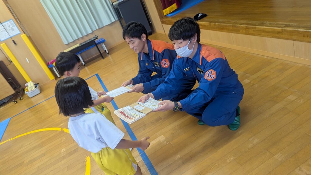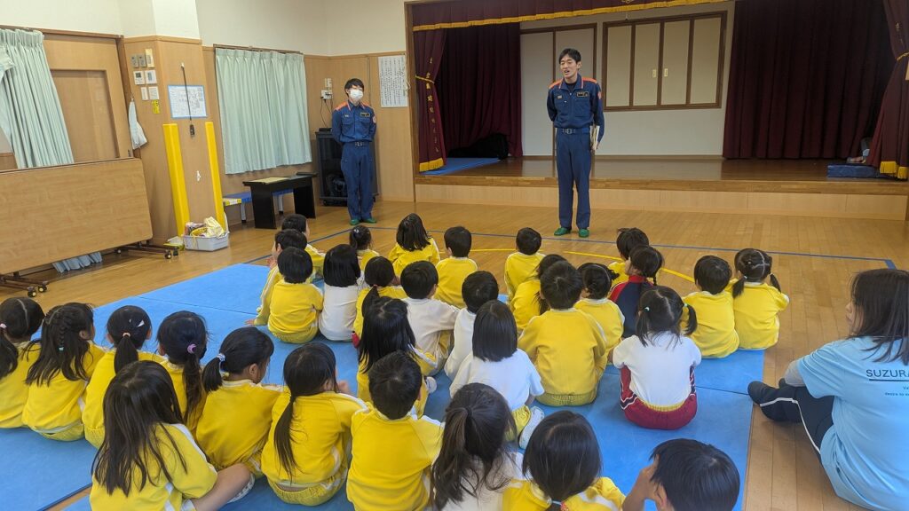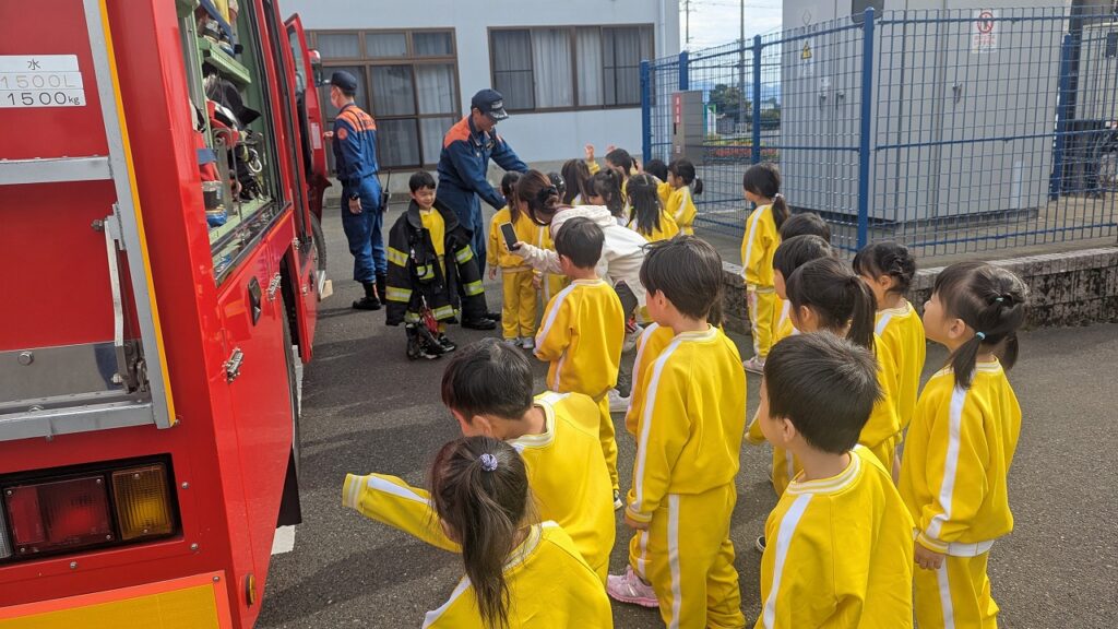 消防署の方が園を訪問され、子どもたちと3つの約束をしました。これから寒くなり、火を使う機会が増えます。火事にならないようにご家庭でもお気を付けください。